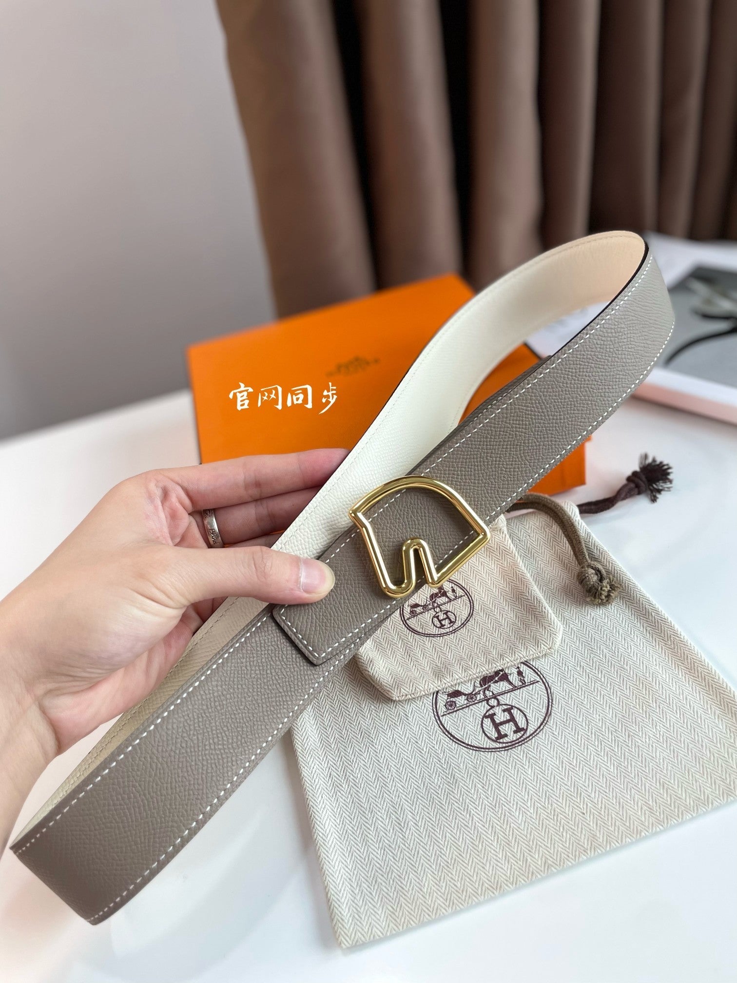 BOUCLE BELT BUCKLE & REVERSIBLE KHAKI BROWN AND WHITE LEATHER STRAP 38MM GOLD HARDWARE