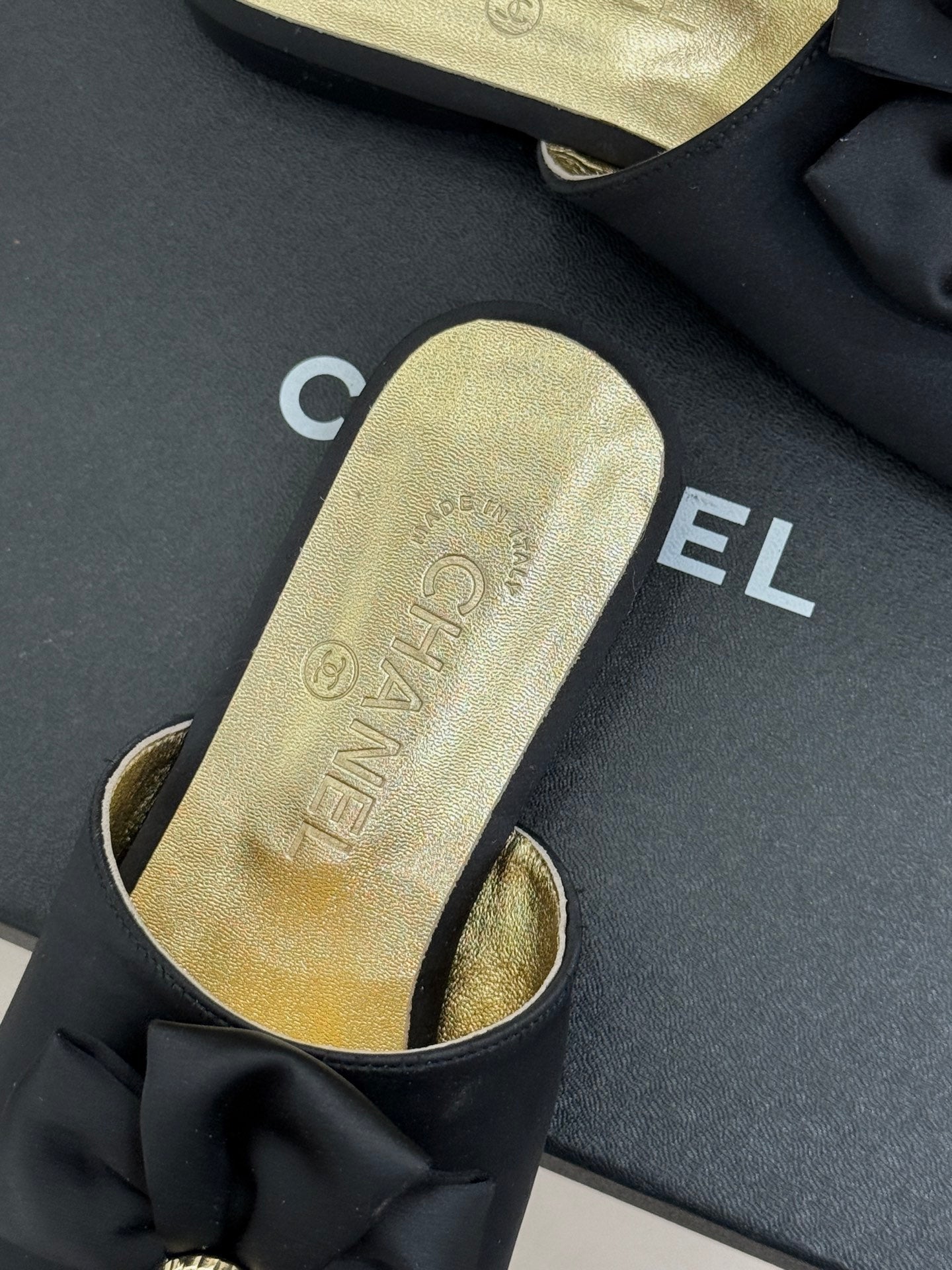 CC 26 Bow Flat Sandal Black Gold Satin Sheepskin 609799