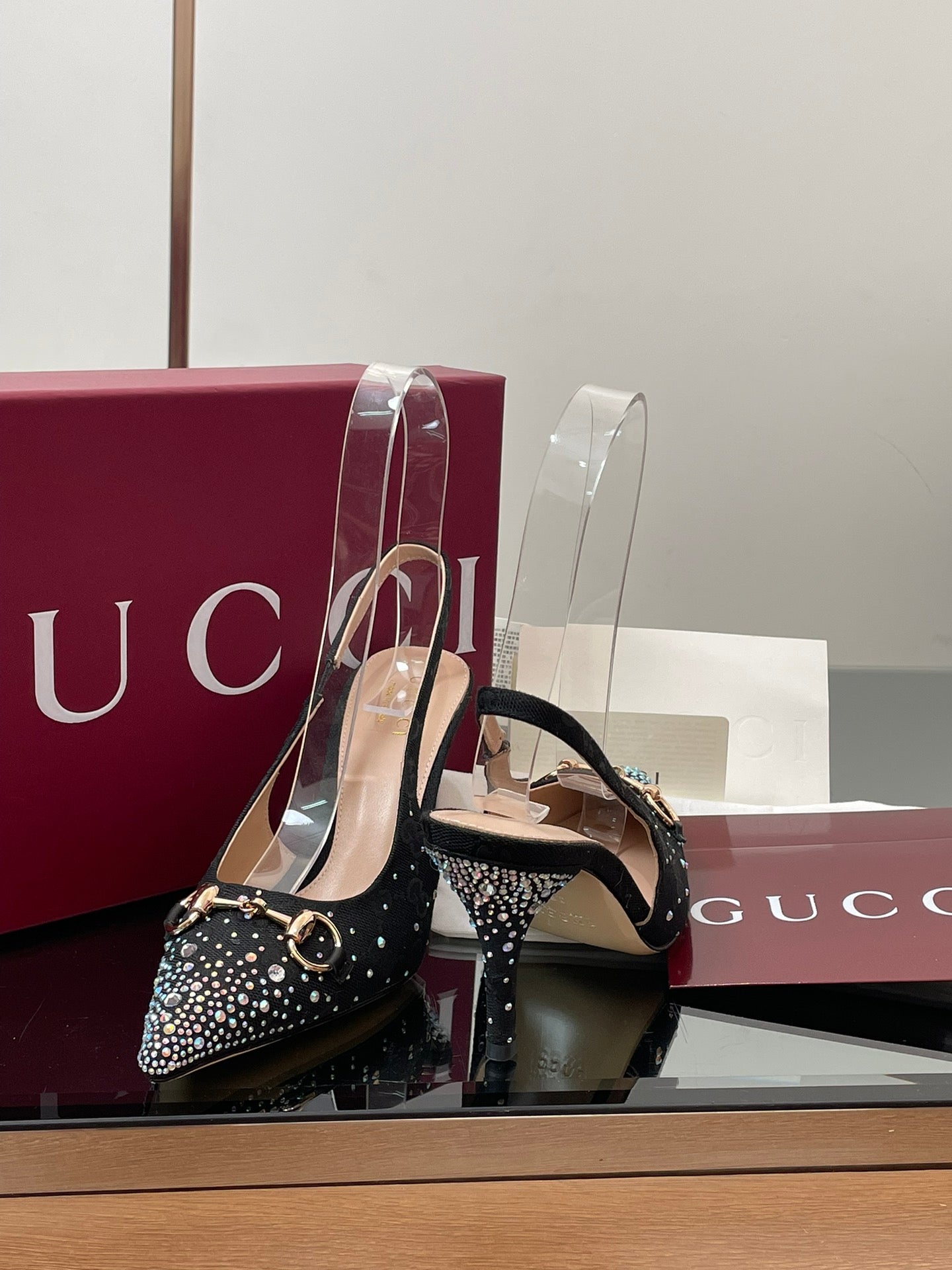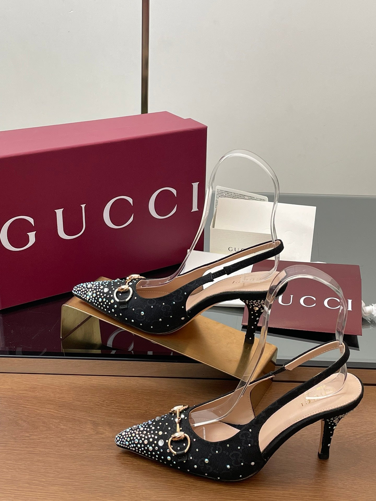 GG Horsebit Slingback 45MM Black Ebony Monogram Canvas Point Toe Crystal-Embellished