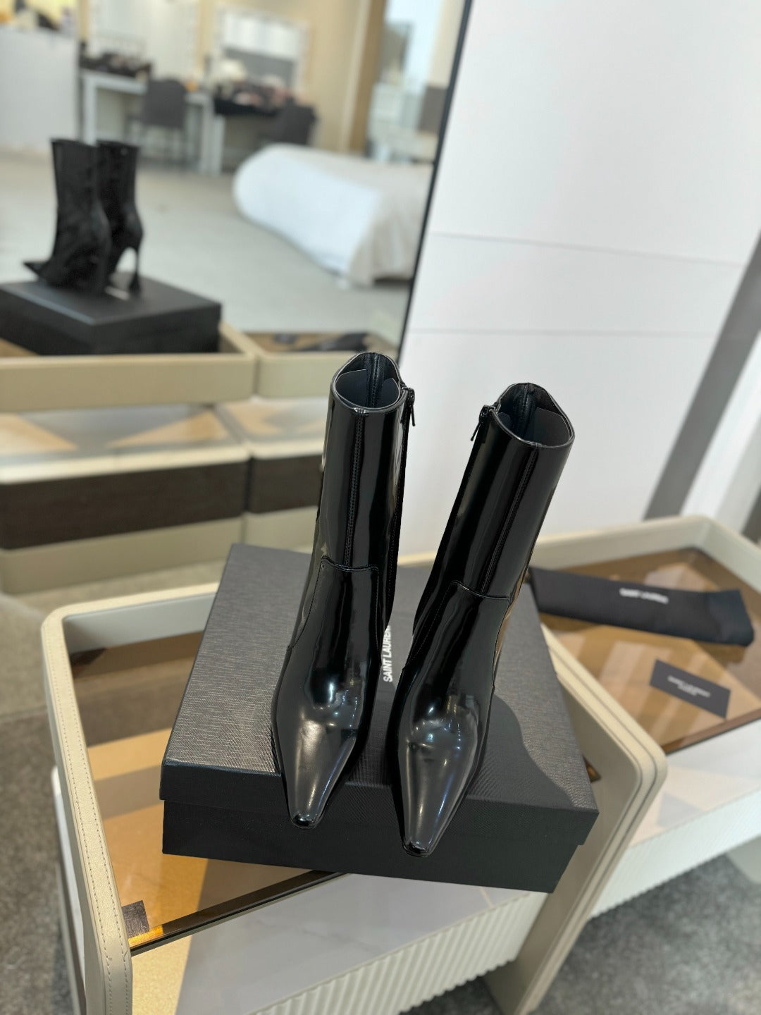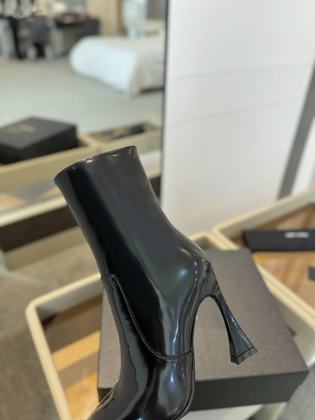 HIGH HEEL POINTED-TOE ANKLE BOOTS IN BLACK SHINY CALFSKIN