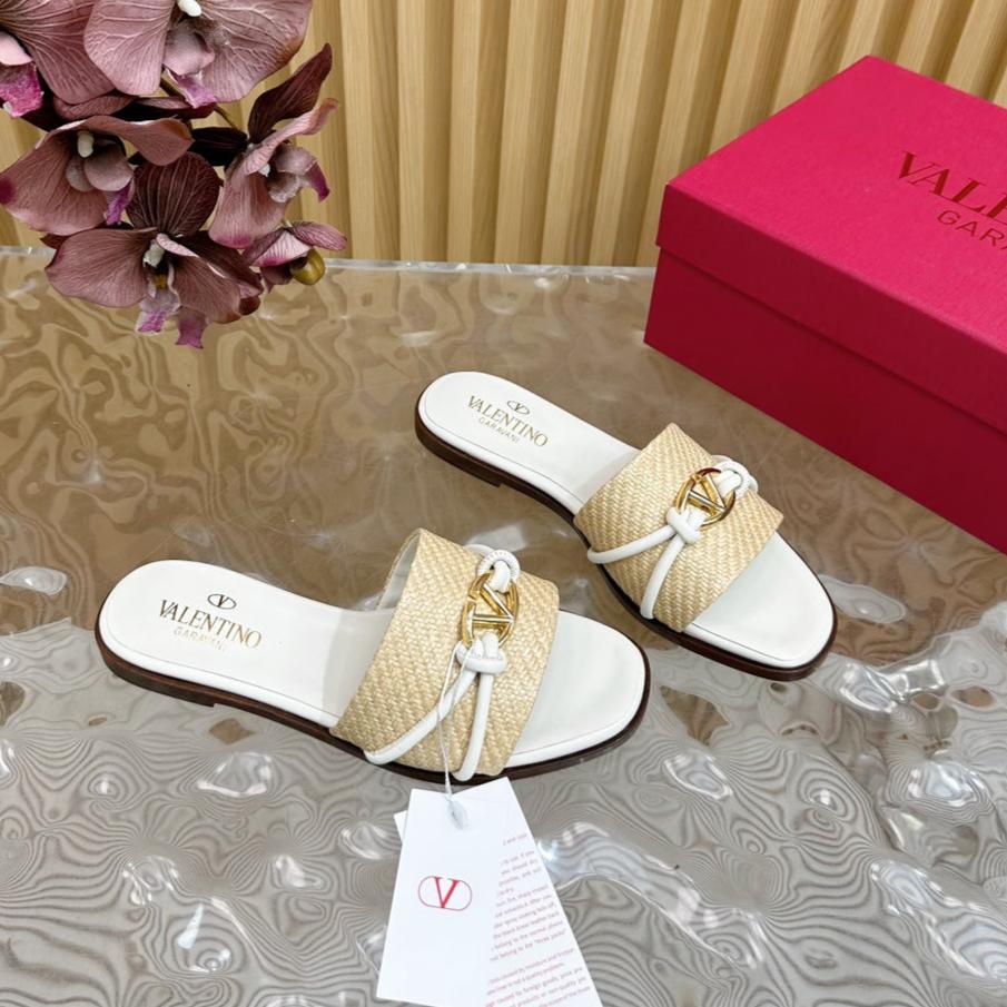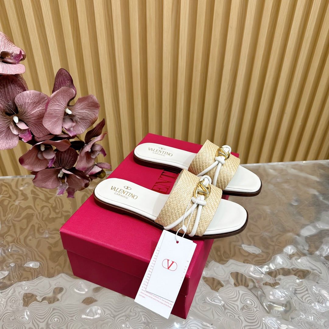 VLogo Raffia-Trimmed Leather Slides In White Mix Beige Sedge Weaving Yarn And Lambskin 102811